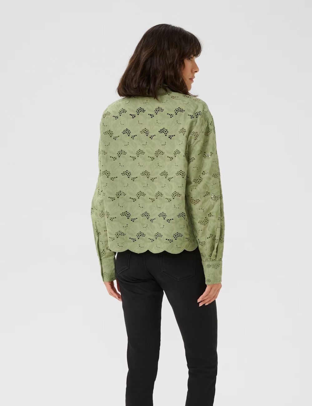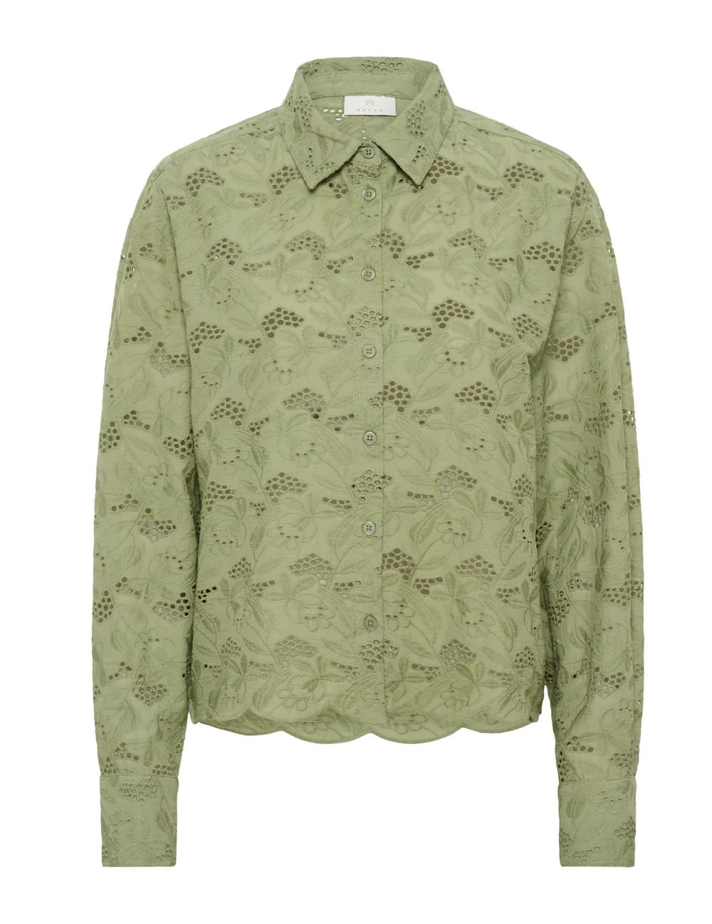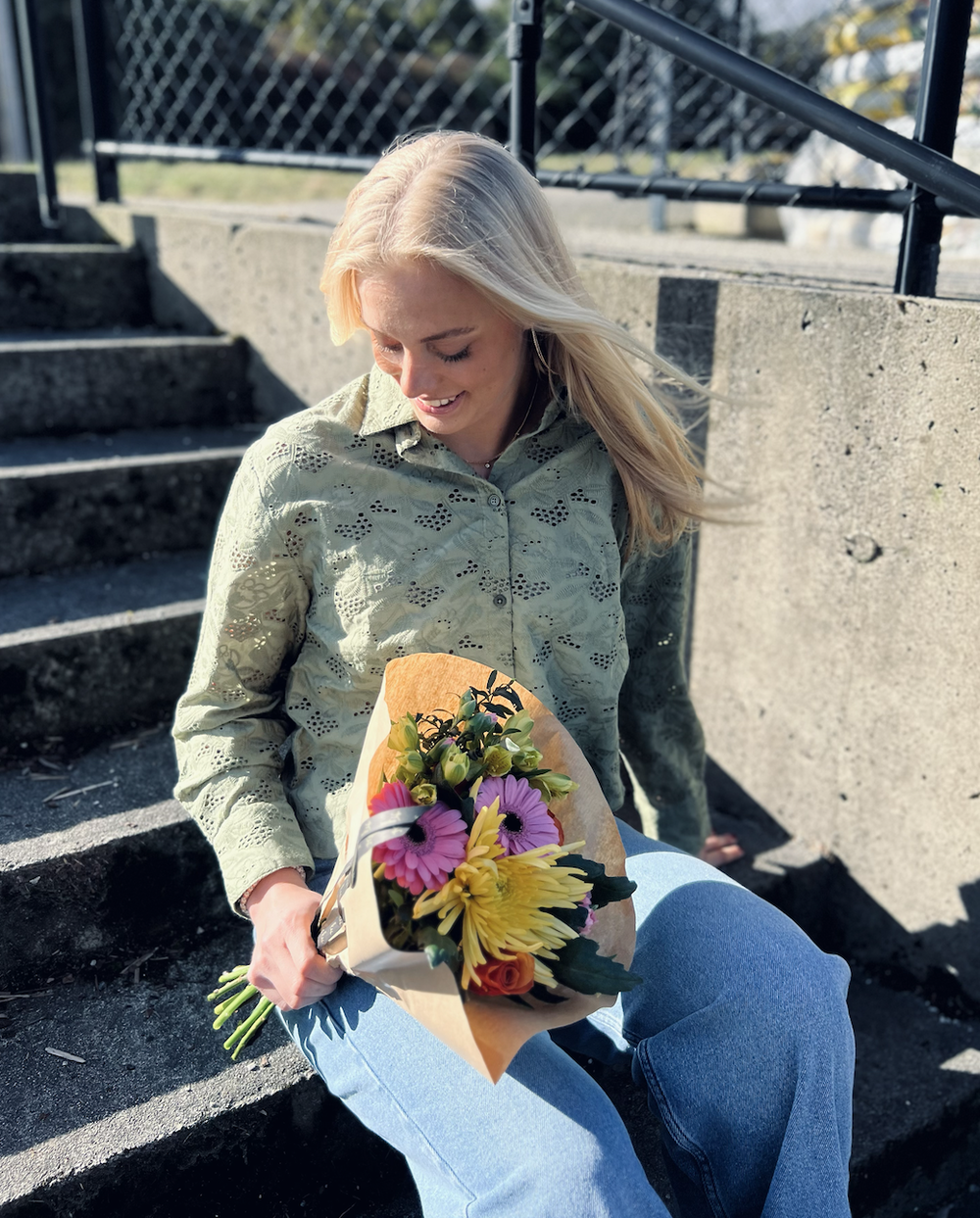 Skjorta kommer i en løs, og kort passform, med knepping i front.