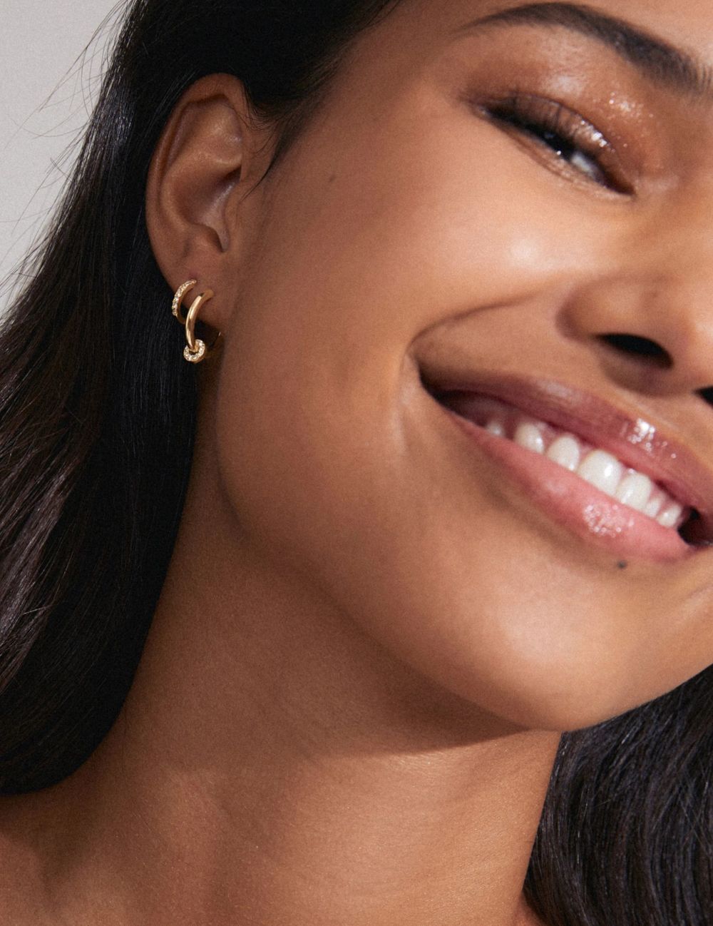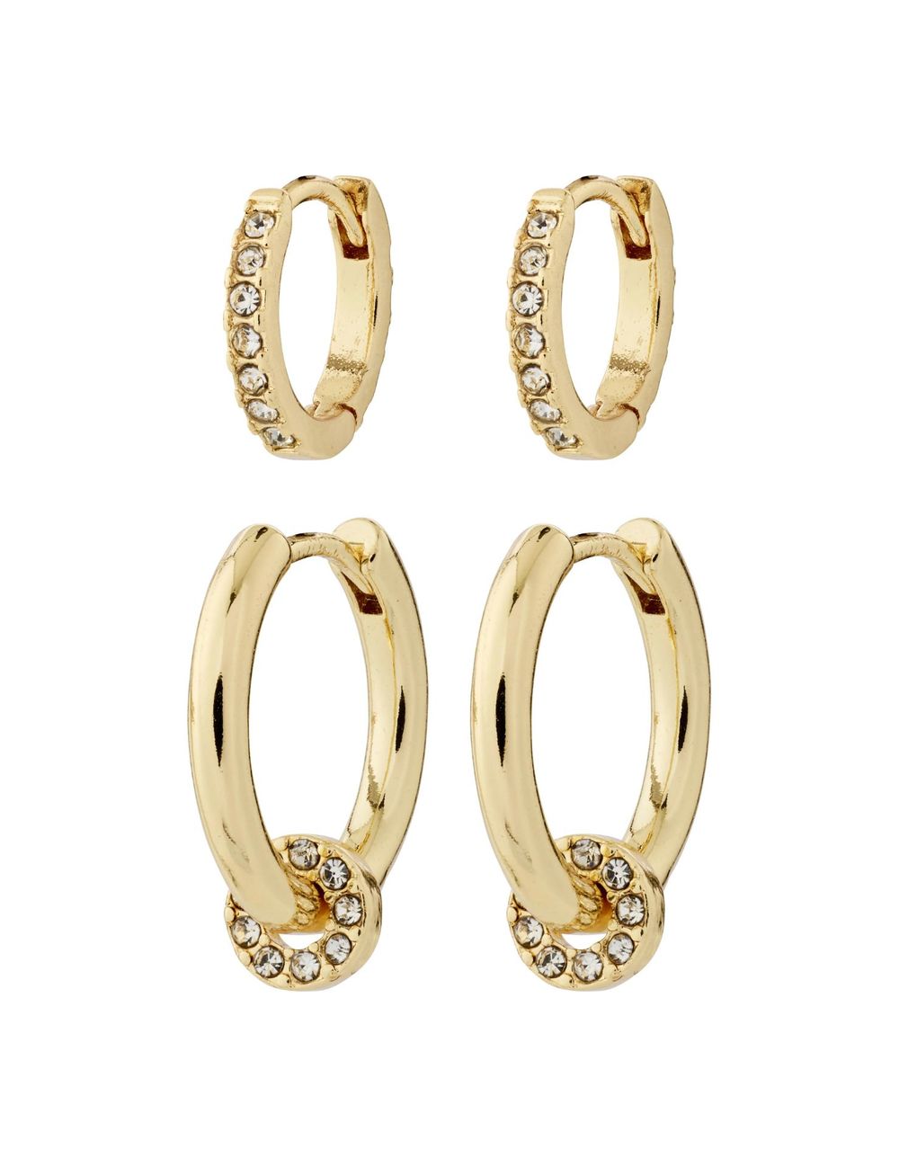 klassiske hoops med en twist av glam. Her får du ett sett huggie hoops med krystaller langs forsiden av øreringen, samt ett sett med skinnende creoler med et sirkulært krystall-anheng