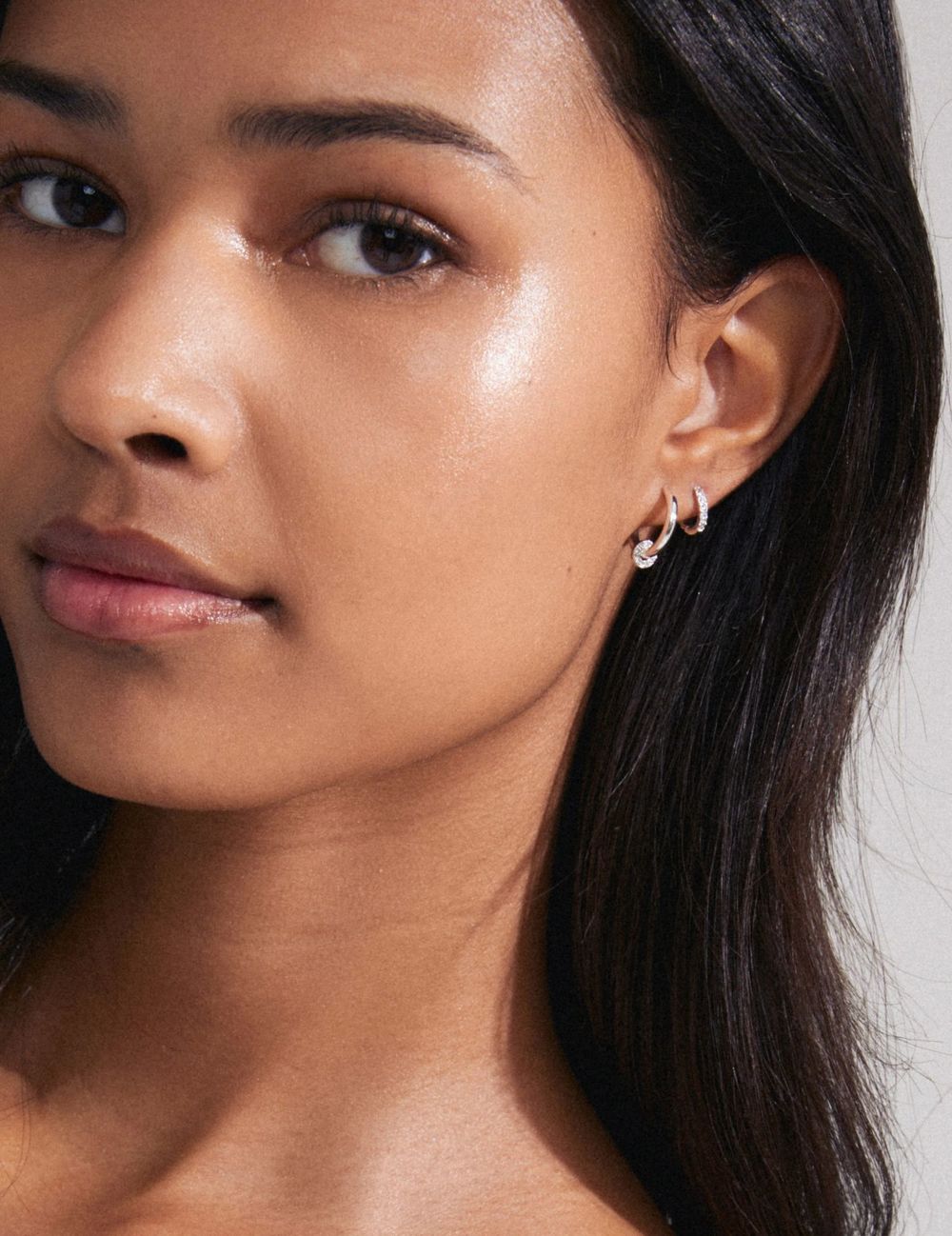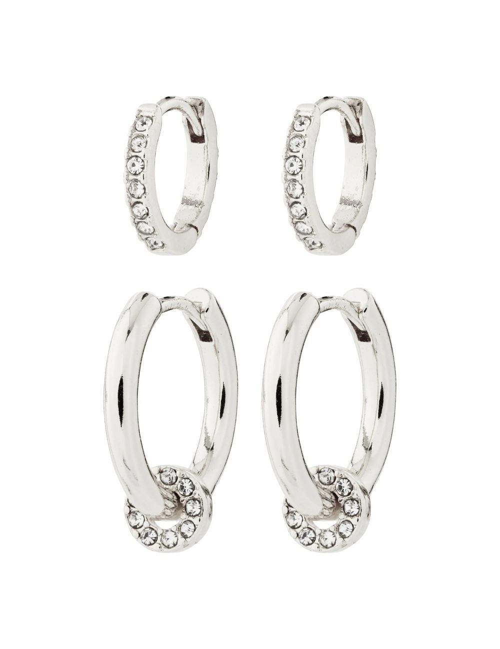 klassiske hoops med en twist av glam. Her får du ett sett huggie hoops med krystaller langs forsiden av øreringen, samt ett sett med skinnende creoler med et sirkulært krystall-anheng